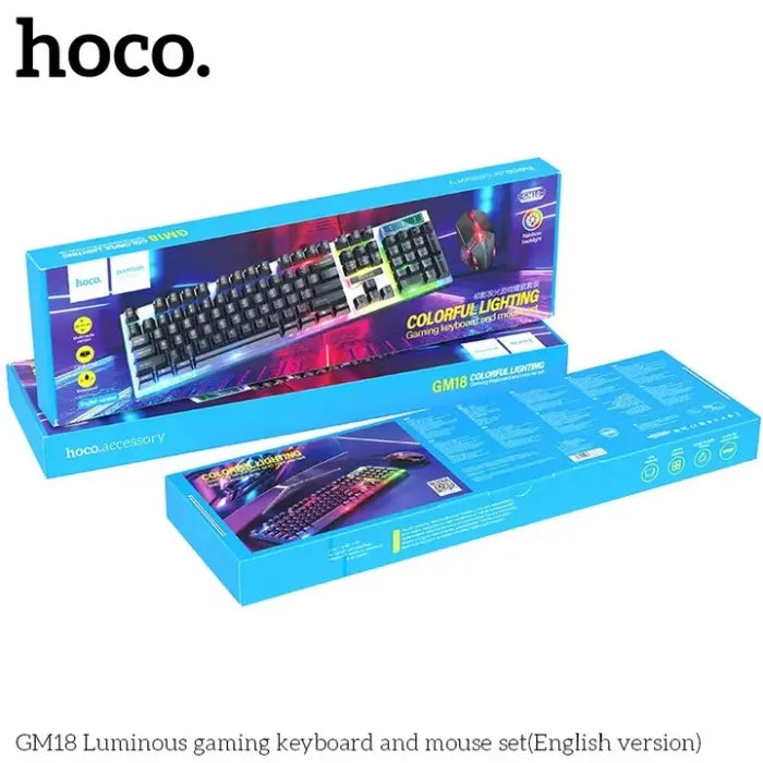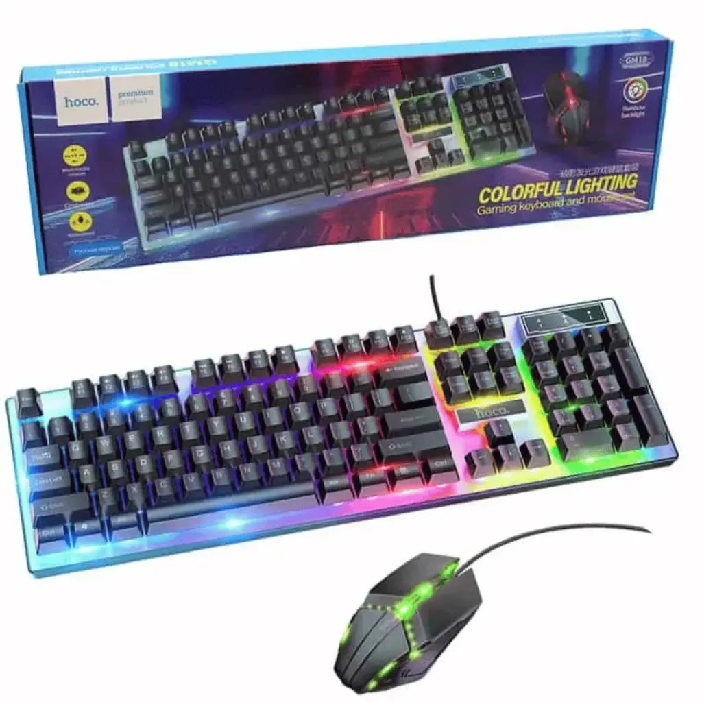 Hoco Luminous Gaming Keyboard and Mouse Set - Keyboard: Mechanical feel keyboard. - Material: ABS + liquid silicone. - Connection method: wired USB, PVC wire, length 1.46m. - Sizes: 440*180*36mm. - English version - Weight: about 700g. - Keys: 104 keys with a service life of about 8 million times. - Lighting: 9 kinds of RGB lighting effects. - Mouse: Material: ABS+ braid, 1.5m cable length. - Sizes: 123*64*40mm. Weight: 87g. - Service life: about 3 million times, 6D keys. - DPI: 800 / 1000 / 1200. - Light: LED colorful breathing light.